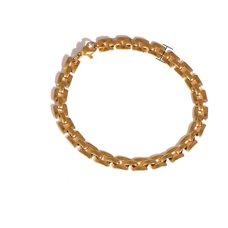 Gelang kotak-rantai emas ini mengadopsi struktur rantai persegi panjang yang terinspirasi dari rantai jam tangan untuk tampilan modern dan terstruktur. Dibuat sepenuhnya dari baja tahan karat dengan lapisan emas PVD 18K, menawarkan kilau tahan lama dan daya tahan kuat—ideal sebagai aksen utama atau dipadukan dengan jam tangan dan gelang lainnya.