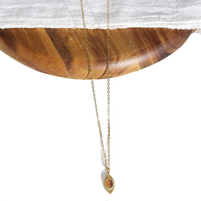 A delicate marquise (leaf-eye) pendant featuring a natural tiger eye stone set in a textured gold stainless steel bezel. The necklace blends vintage charm with spiritual energy—lightweight, adjustable, and perfect for everyday wear or gifting.