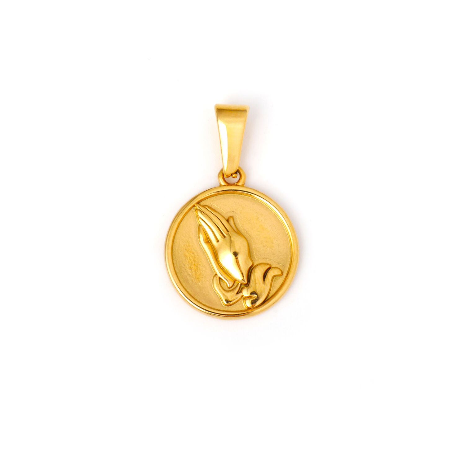 This Praying Hands Medallion Pendant showcases a raised relief design of praying hands, symbolizing faith, blessings, and spiritual protection. The golden round medallion offers a timeless look, ideal for religious wearers or anyone seeking a meaningful and peaceful accessory.
