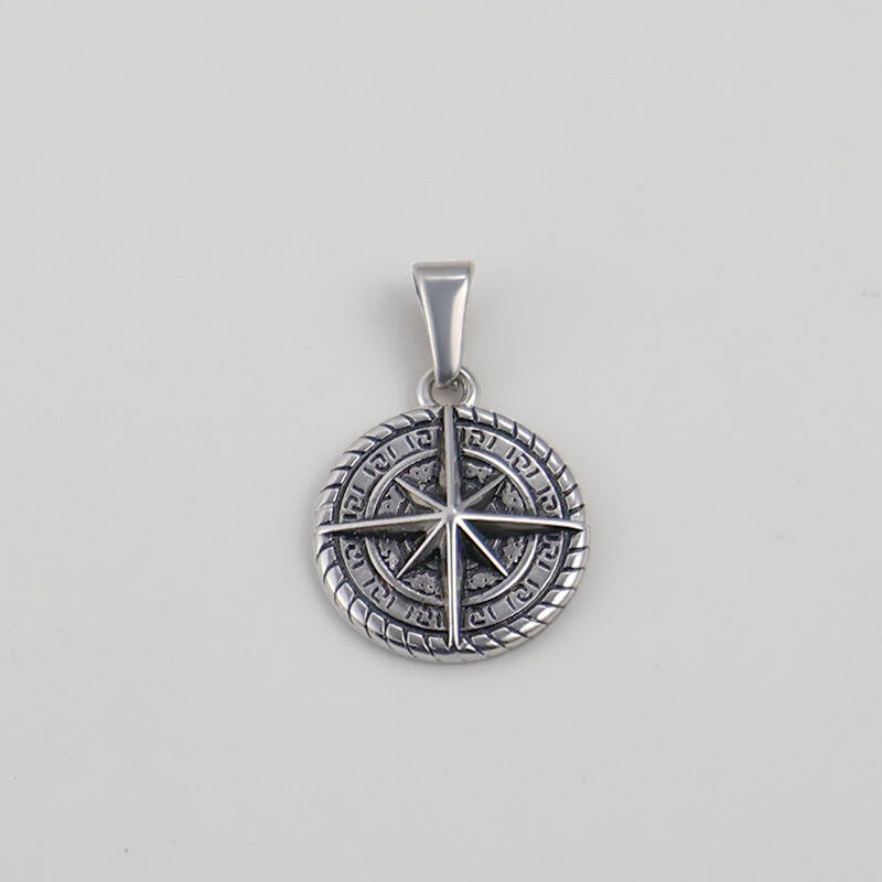 The medallion is round with a compass/guitar pattern at the center and engravings or small dots around the perimeter, giving it a slightly classic nautical badge feel. The hanging ring is concealed and secure.